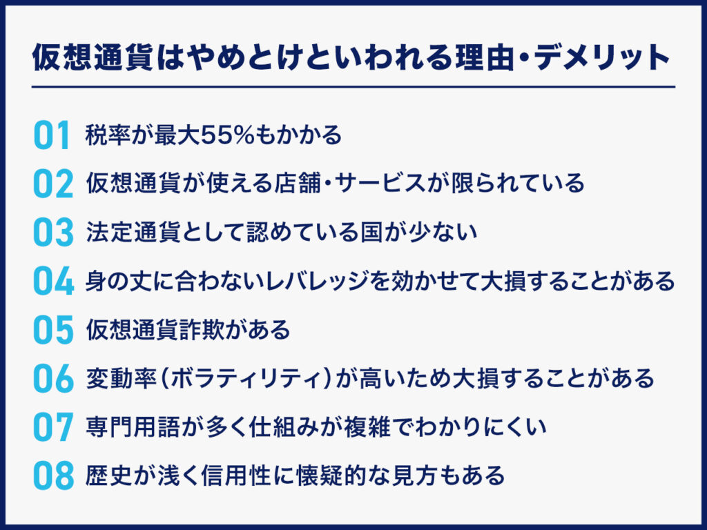 @kkennkennken■仮想通貨/ビットコインのデメリット 常に値動きを監視し続けるのは難しい 24時間取引できるということは、反対にいえば常に値動きを監視し続けるのは難しいということである。短期的な値動きを監視し続けて本業などが疎かになるのは本末転倒であるため、長期を前提に投資することが重要だ。